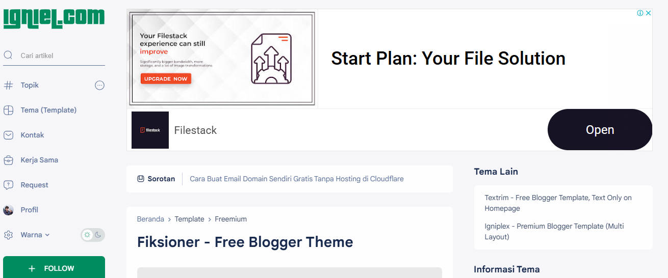 두 번째는 인도네시아 인기 테마 제작자인 Igniel이 만든 Fiksioner v4입니다. 텍스트 위주의 블로그를 운영하는 분들에게 강력히 추천하고 싶은 테마인데요, 가독성이 뛰어난 폰트와 여백 활용이 탁월한 구조 덕분에 글의 전달력이 매우 좋습니다. 심플함을 유지하면서도 광고 배치가 자연스럽고, 반응형 디자인을 통해 모바일과 데스크탑 환경 모두에서 안정적인 레이아웃을 보여줍니다. 특히 뉴스, 시사, 에세이 중심의 콘텐츠를 다루는 블로그에 적합하며, 페이지 속도 역시 준수한 편입니다.