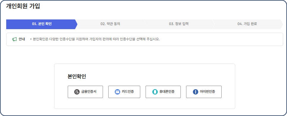▶ 최초 로그인은 아이디/비번으로 가입하여 '본인인증' 절차를 걸칩니다.