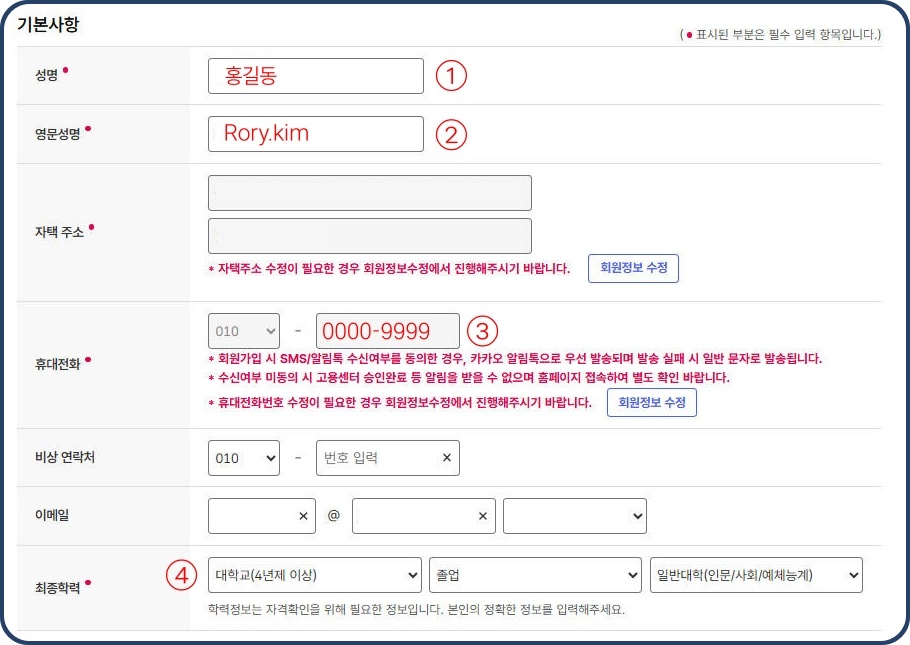 2) 기본사항 입력 - 개인정보에 대한 내용을 입력합니다.