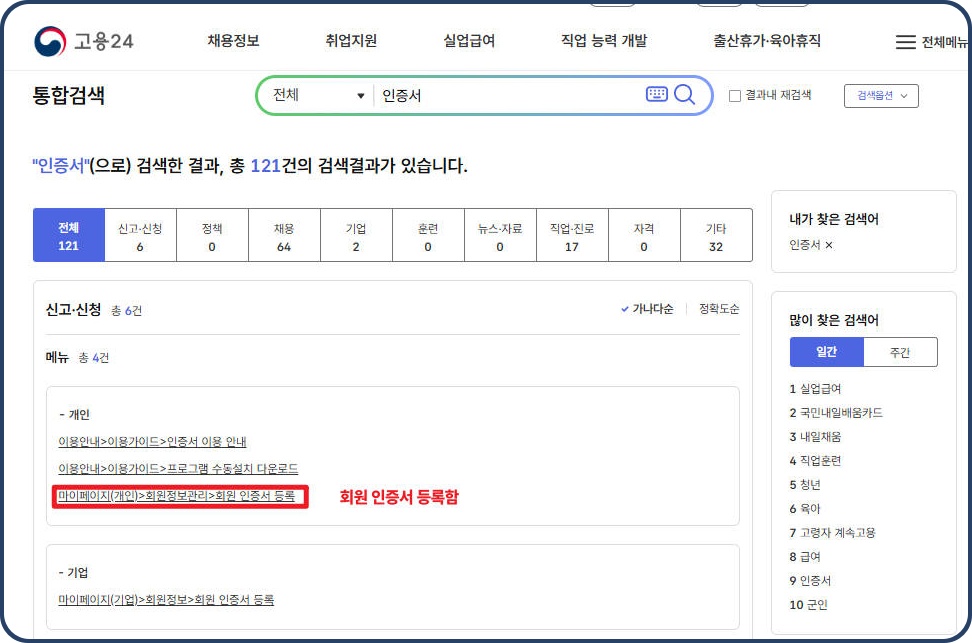 ① 검색창에 "인증서" 라고 입력해서 인증서 등록.(카드발급 신청은 공인인증서 필수!)