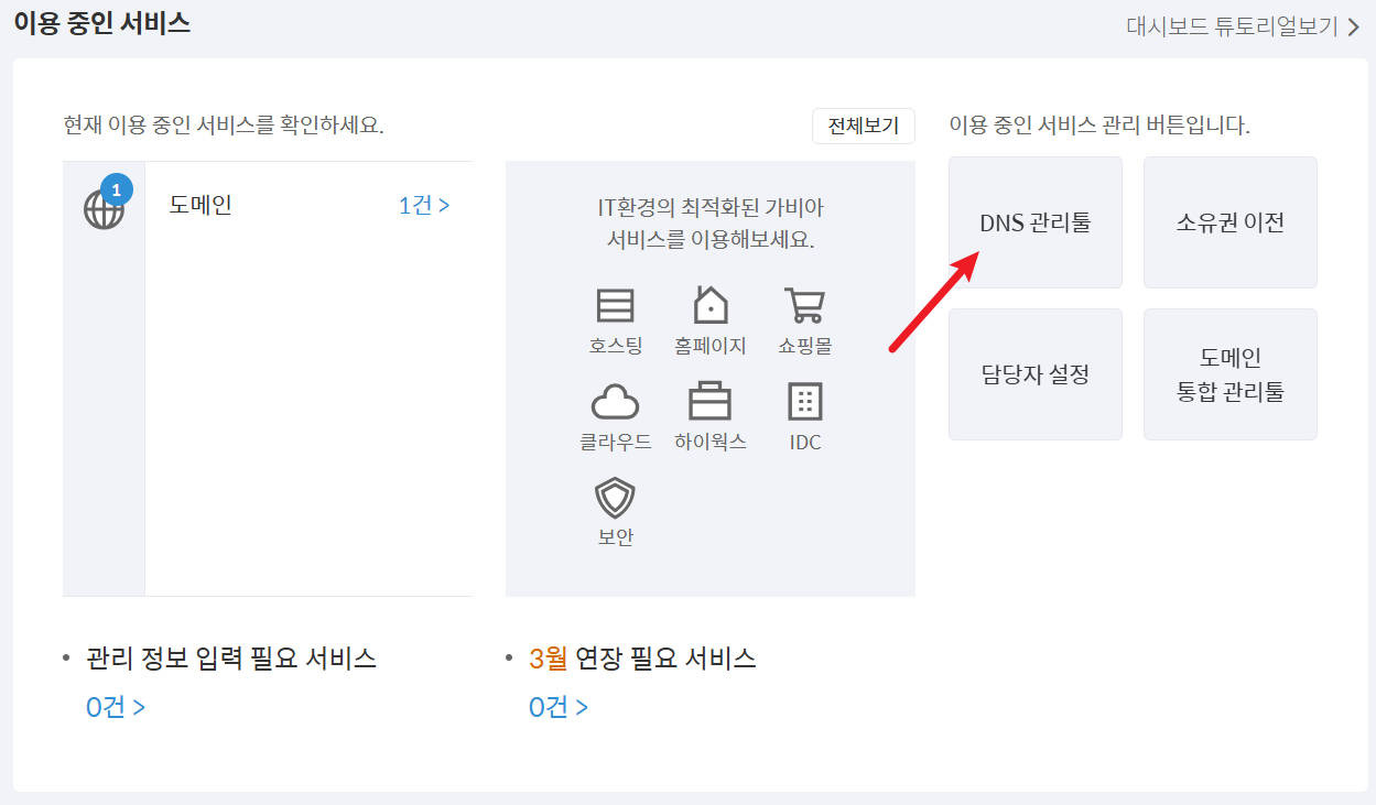 1. 도메인을 구매한 사이트(예: 가비아)에서 DNS 관리툴 페이지로 이동합니다.