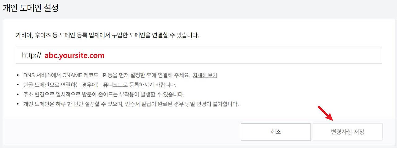 설정을 저장한 후 10~30분 정도 기다려야 적용됩니다. 이후 티스토리에서 개인 도메인 설정을 진행하면 됩니다.
