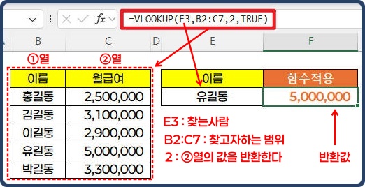 • 찾을값: 테이블에서 찾고자 하는 값으로, 첫 번째 열에서 검색합니다.
