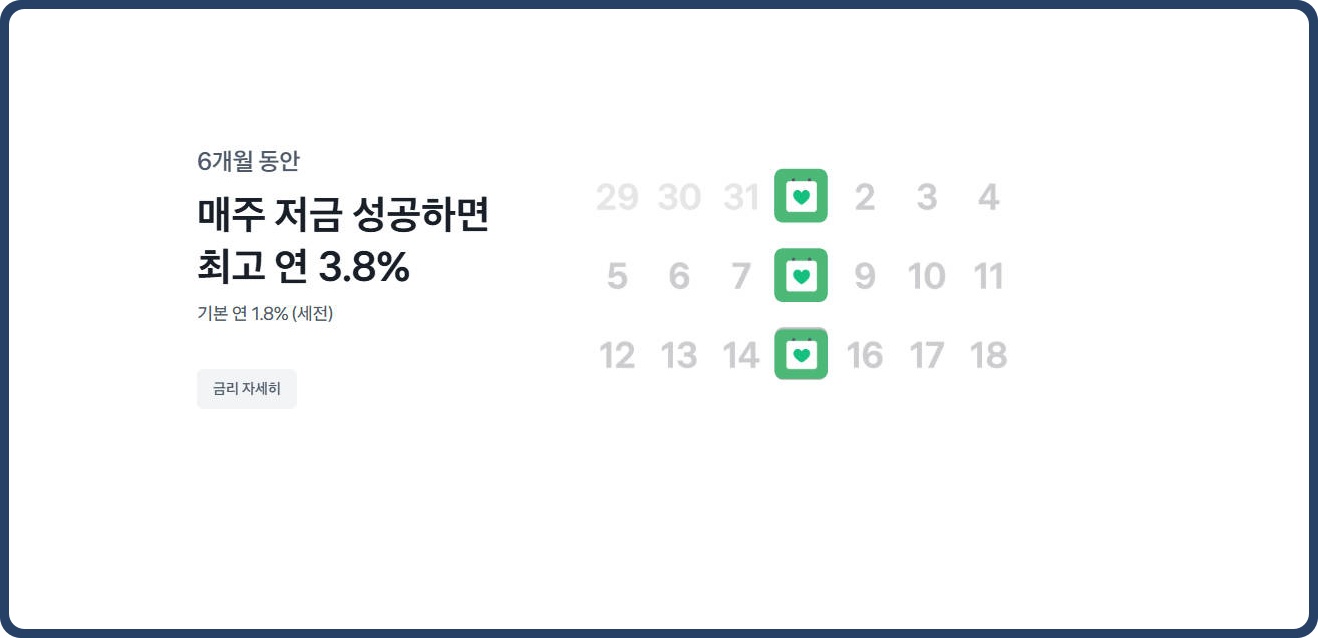 - 미션 조건: 매주 자동이체로 저금을 성공해야 최고 금리 달성 가능