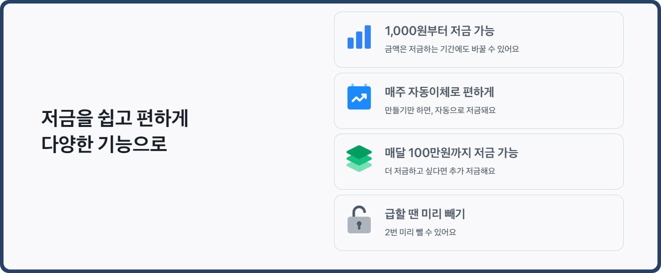 - 시작 금액: 1,000원부터 저금 가능하여 진입장벽이 낮음