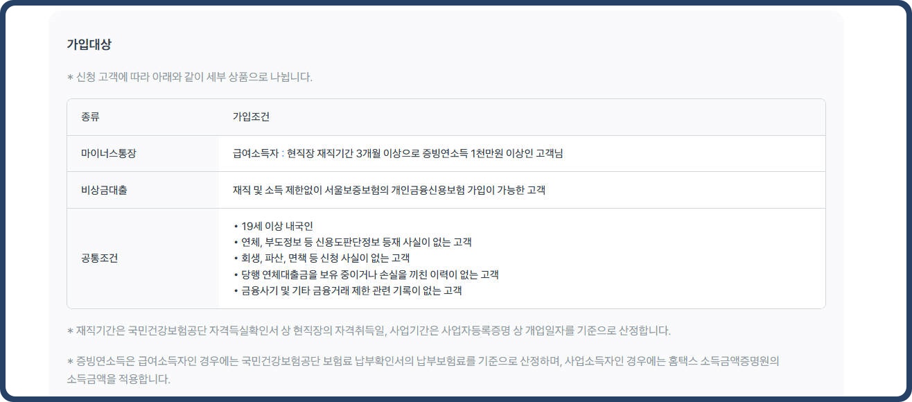 반면 비상금대출은 재직 및 소득 제한 없이 서울보증보험의 개인금융신용보험 가입이 가능한 고객이면 신청할 수 있습니다. 두 상품 모두 19세 이상 내국인이면서 신용도판단정보가 없어야 합니다.
