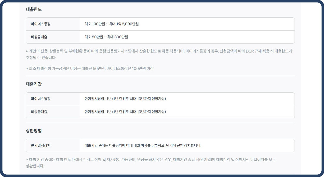 - 가산금리: 마이너스통장 2.24%~4.14%, 비상금대출 1.99%~11.86%