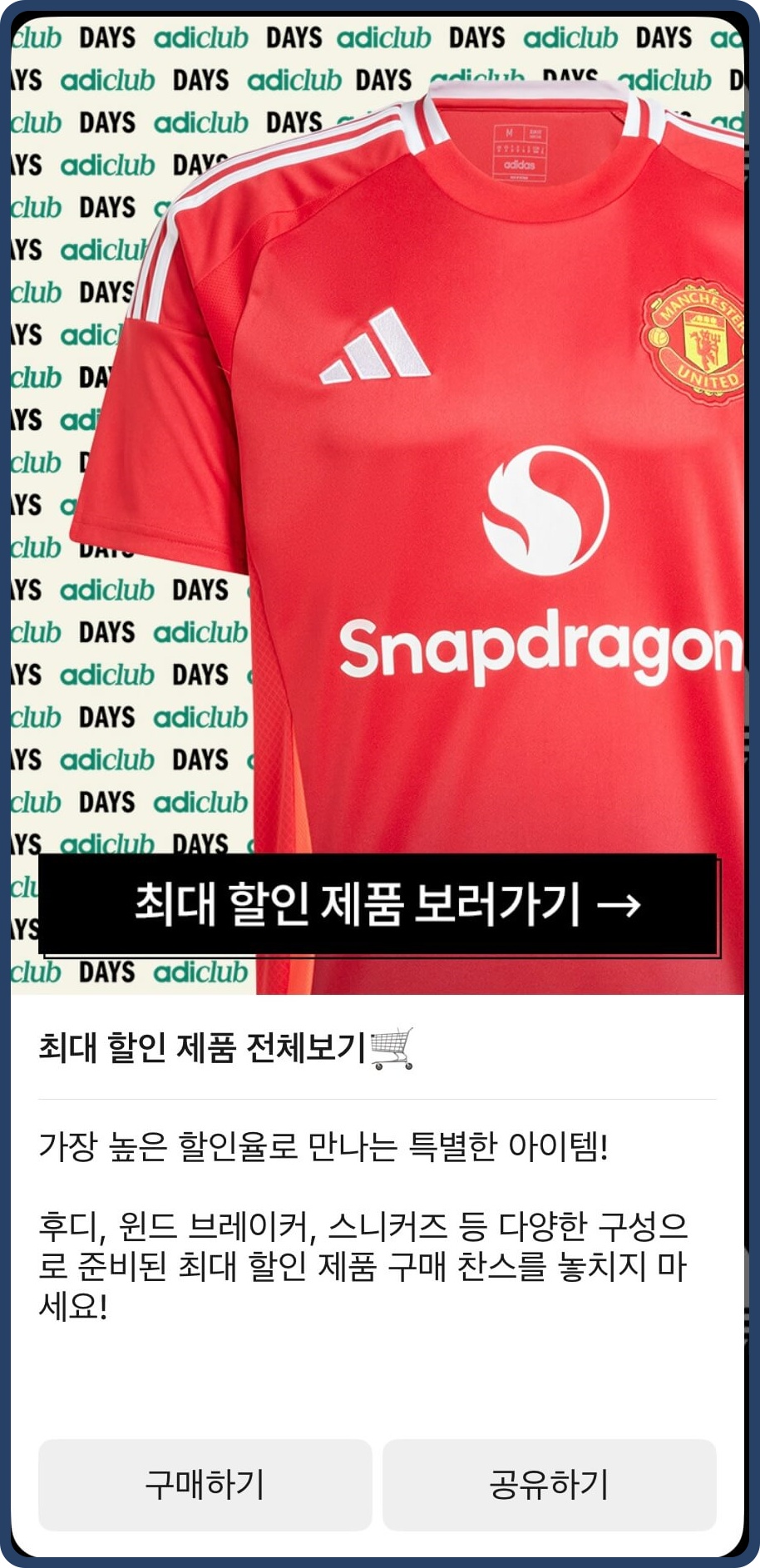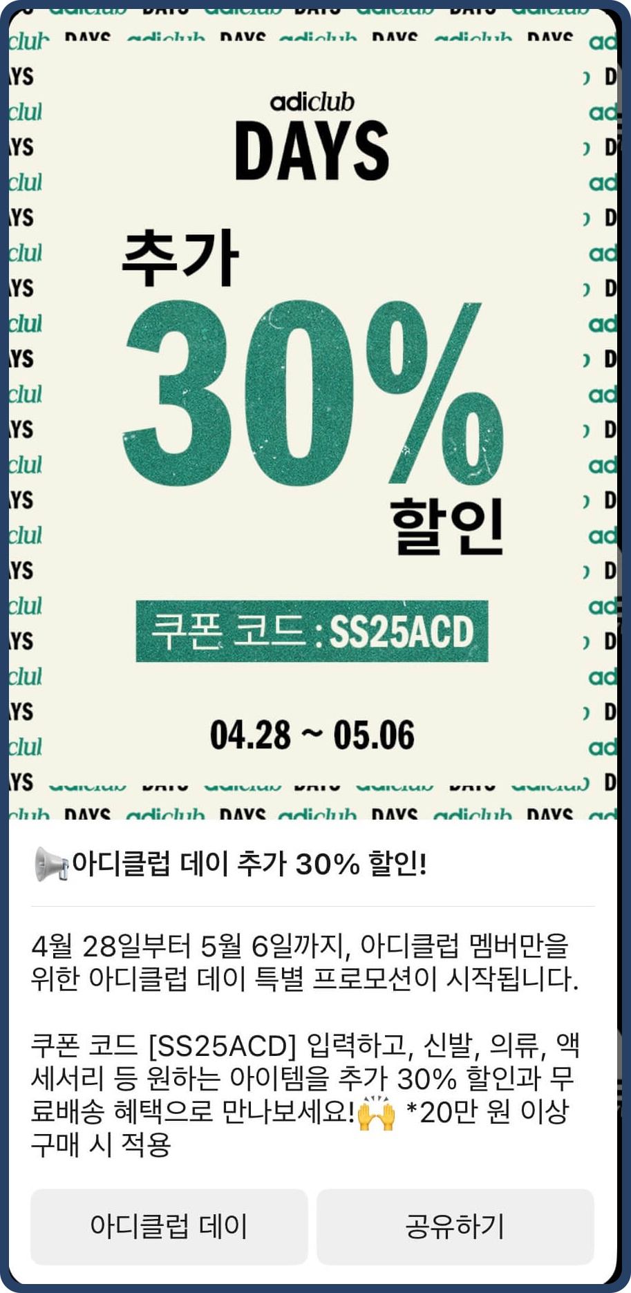 이번 프로모션은 아디클럽 회원만을 위한 전용 혜택입니다. 아직 아디클럽 회원이 아니라면, 공식 웹사이트나 앱에서 간단한 가입 절차를 통해 바로 멤버가 될 수 있습니다.