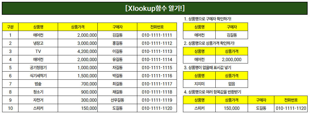- 상품명으로 여러 정보 가져오기: =XLOOKUP(H14,C4:C14,D4:F14) - 상품명으로 "상품가격""구매자""전화번호" 반환