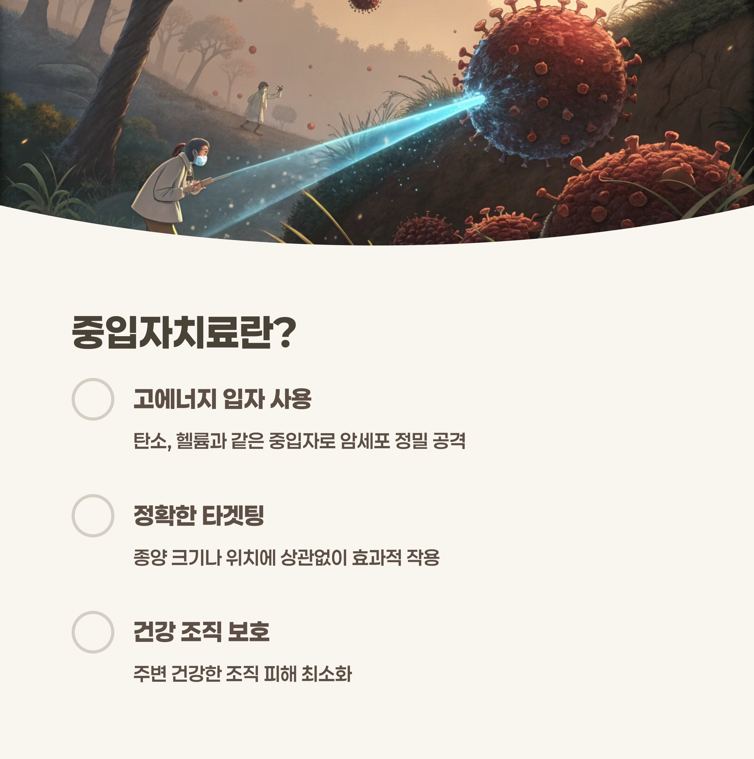중입자치료는 방사선 치료의 일종으로, 암 세포를 정밀하게 타겟팅하여 치료하는 첨단 기술로 주목받고 있습니다.