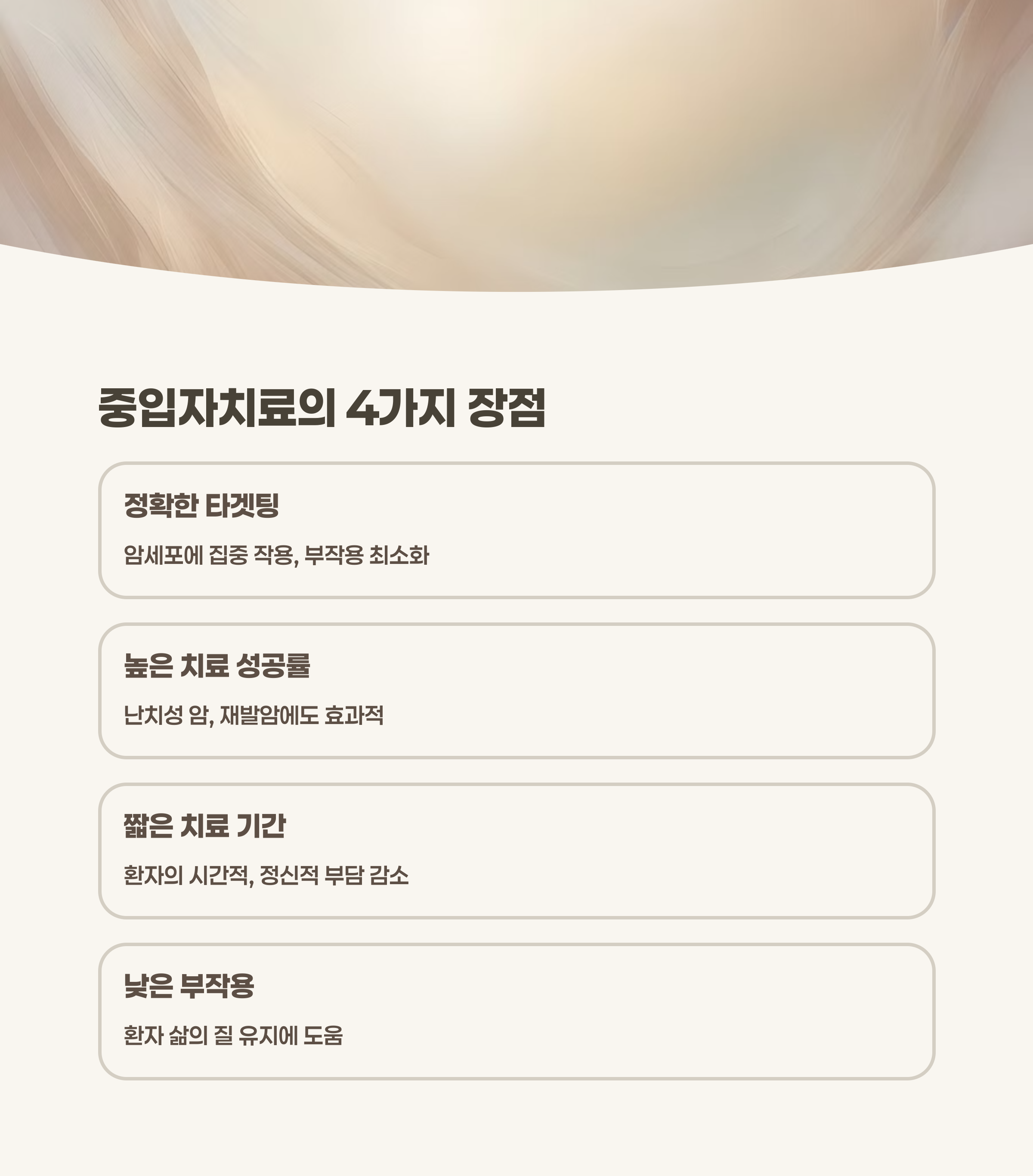 중입자치료는 정밀성과 효과성 측면에서 여러 가지 뚜렷한 장점을 가지고 있습니다. 이런 장점들은 환자의 치료 효과를 높이고 삶의 질을 유지하는 데 큰 도움이 됩니다.