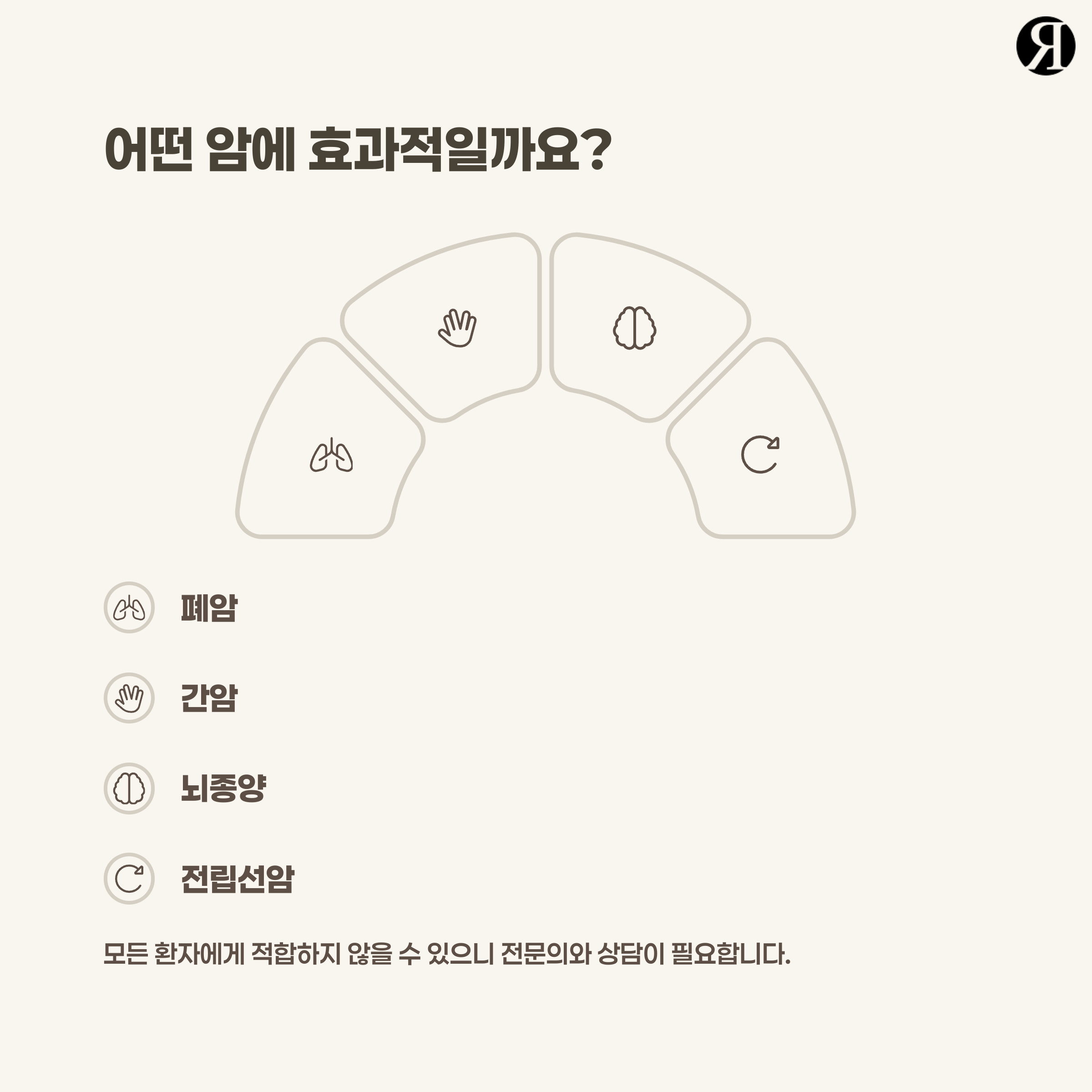 특히 고형암(solid tumor) 환자에게 효과적이며, 각 환자의 개별적인 상태와 암의 특성에 따라 적합성이 결정됩니다.