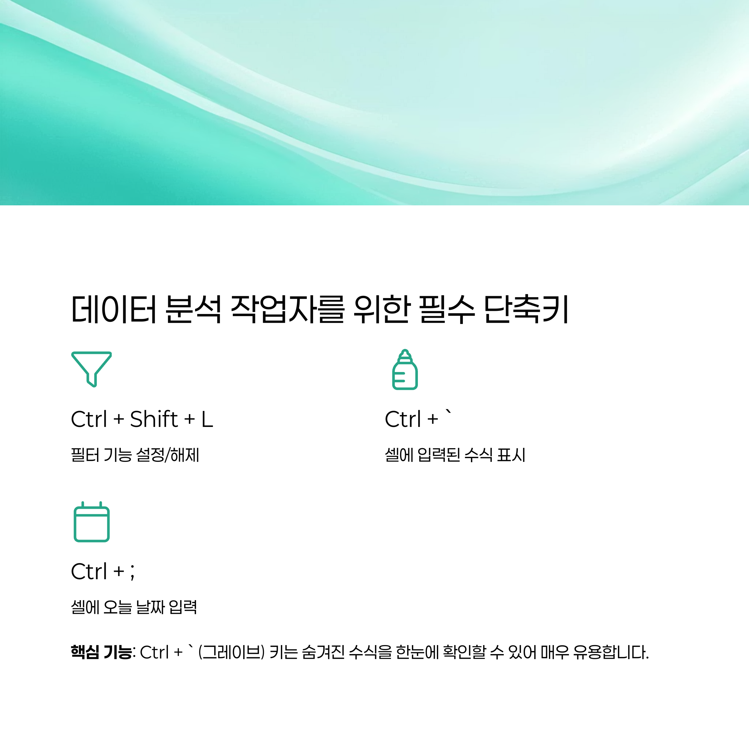 데이터 정렬, 필터, 수식 확인 등 분석에 필요한 단축키도 다양합니다.