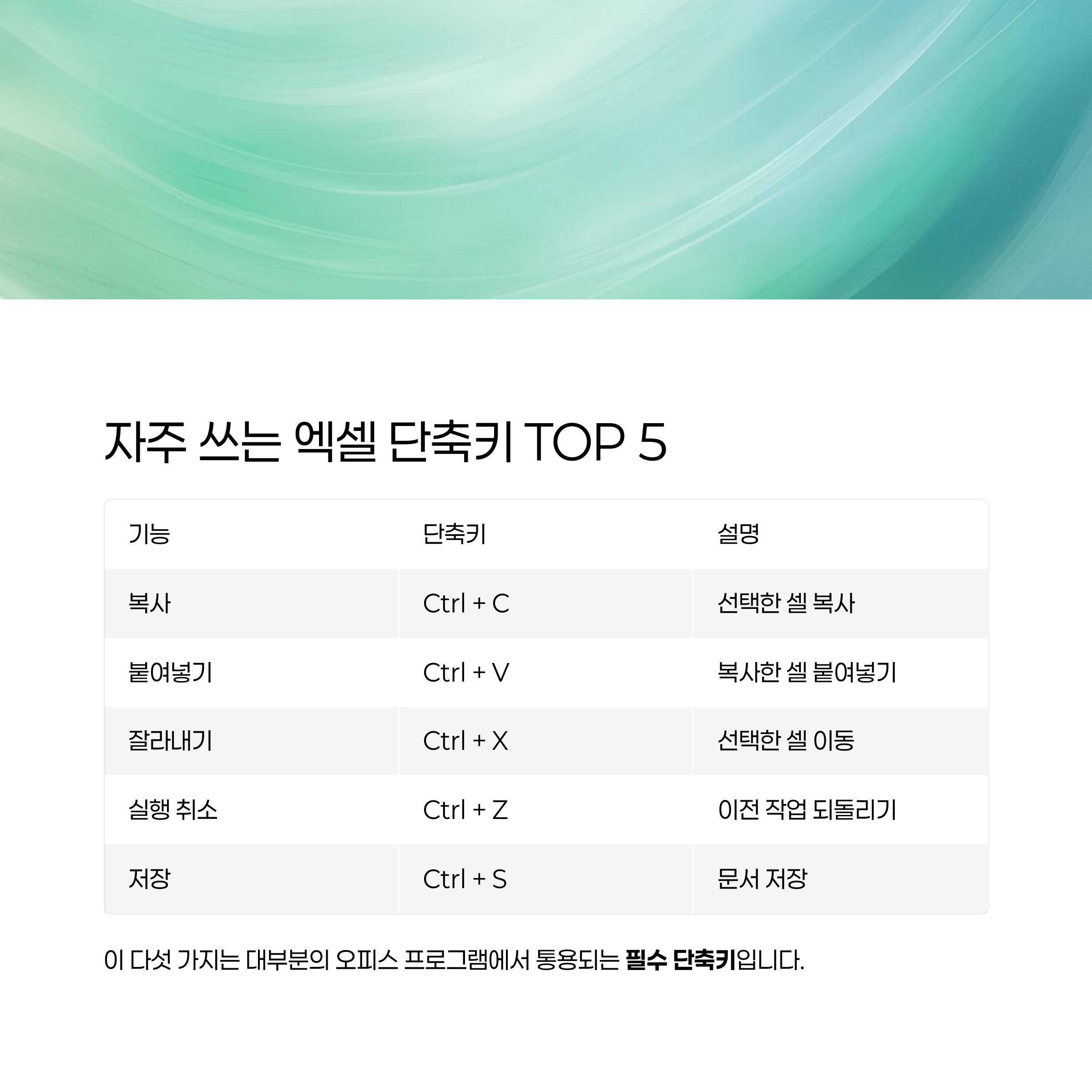 엑셀 초보자라도 반드시 외워야 할 핵심 단축키 다섯 가지를 정리했습니다.