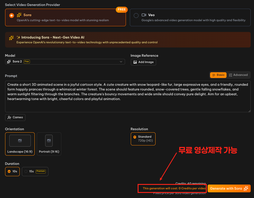 [소라2 영상 제작 화면] (이미지 설명: 텍스트 프롬프트를 입력하여 소라2 모델로 영상을 생성하는 화면)