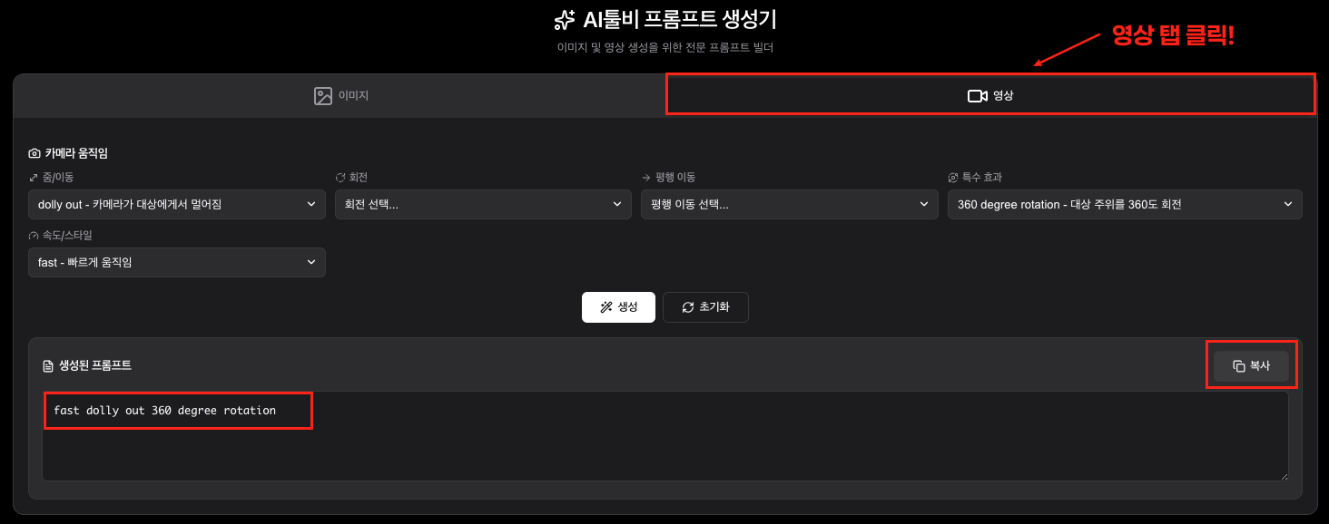 '툴비 프롬프트 생성기'의 영상 탭을 활용해 보세요.