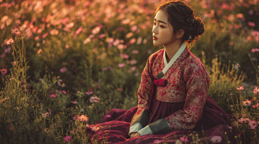 a young korean woman in her 20s, sitting elegantly, in flower field, sunrise lighting, full body shot, photorealistic, warm tones, 8K resolution, ultra detailed