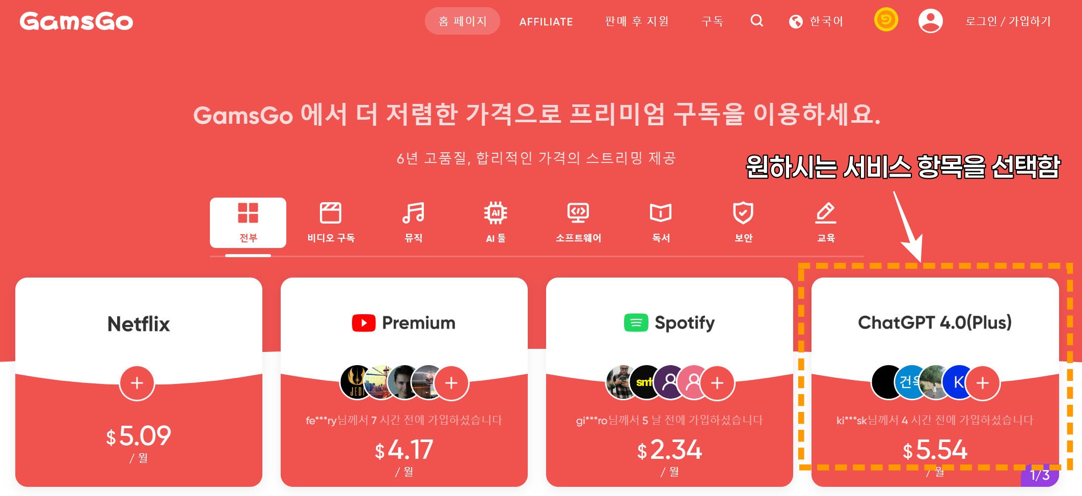 1. 겜스고 사이트 이동해서 로그인 하여 "원하시는 서비스 항목을 선택함" - ex) ChatGPT, 감마AI 등